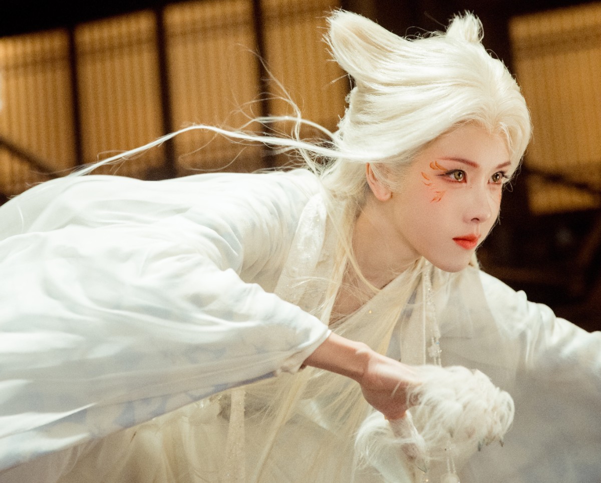 银发狐妖造型一出场,直接封神!那一头如雪岭寒松般的白发垂落肩头,额间缀着细碎银链和冰晶额饰,眼尾一抹绯色纹路若隐若现,既撩人又疏离。耳畔流苏随动作轻晃,仿佛把千年的孤寂都摇成了风里的低语。再配上那件素白纱袍——薄如蝉翼,暗绣狐纹,在光影下泛着月华般的光泽。静坐时像古画里走出来的谪仙,一抬袖却气场全开,权柄在握。神与妖在她身上不是对立,而是共生,美得让人屏息。