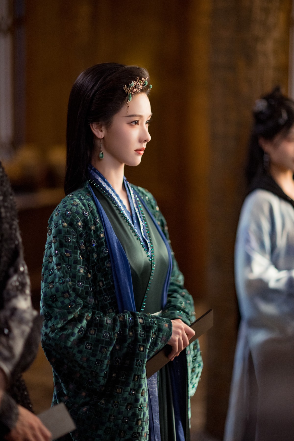 别以为雾妄言只会冷艳狠辣,她的青绿色系造型立马给你切换频道。格纹外袍缀满细闪钻,在暖光下温润如玉,内搭深绿衬裙与蓝色贴里层层叠叠,质感满分。发间玉石簪子与耳坠遥相呼应,妆容淡雅却气场稳如泰山——这一刻的她,不是魅惑众生的狐妖,而是运筹帷幄的谋士,沉稳、克制,却又步步为营。