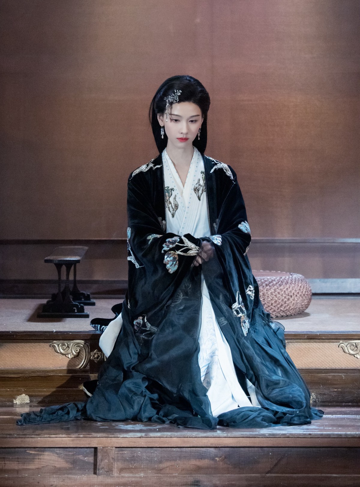 而当她换上墨色华服,气场直接拉满到“生人勿近”。黑丝绒外袍用银线绣出暗纹,幽冷光泽随光影变幻,内搭却是素白衬裙,厚重中透出一丝清透,恰如她在黑暗中始终守住的那条底线。银质额饰与珠帘垂落,为清冷面容添了几分神性;妆容虽淡,眉眼之间却暗潮汹涌。静坐时是破碎感拉满的孤独者,施法时又是掌控全局的压迫者——同一套造型,两种极端情绪,演得观众心都揪起来了。